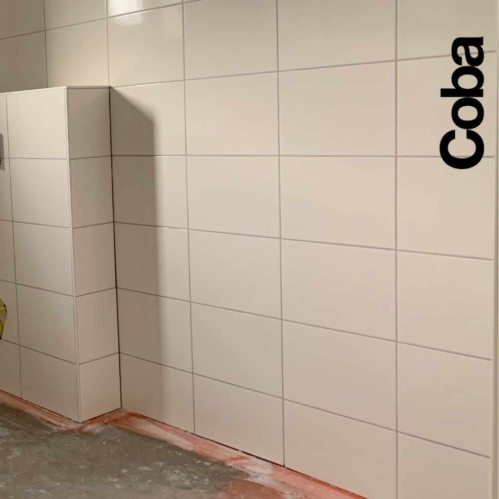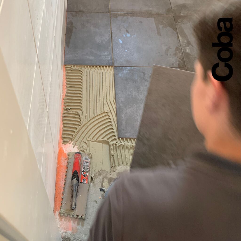 Tegelzetbedrijf Leenders verlijmt de tegels op dit project. Zo werken de mannen met de volgende Coba producten: ASP900 & ASP910, DPM800 voorstrijkmiddel, DTA215 & DTA218 pastalijm, CTA140 poederlijm en CGM300 voegmiddel.